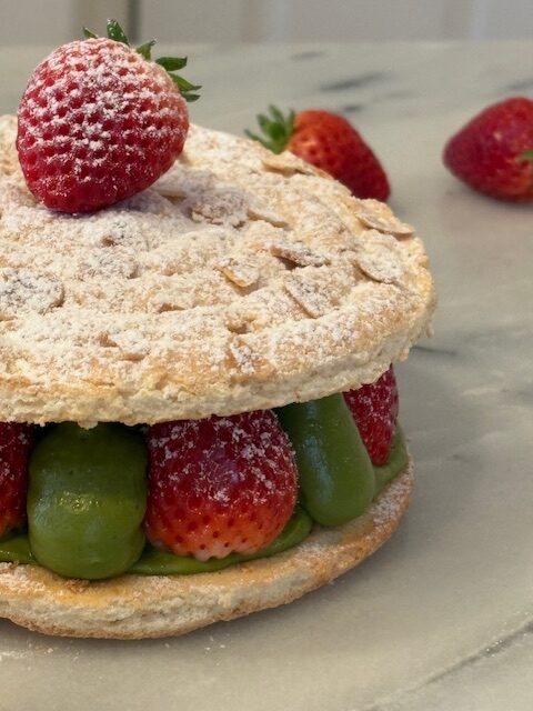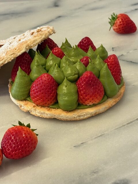 抹茶のムスリームクリームと苺をダックワーズ生地で挟んだ華やかななケーキ。