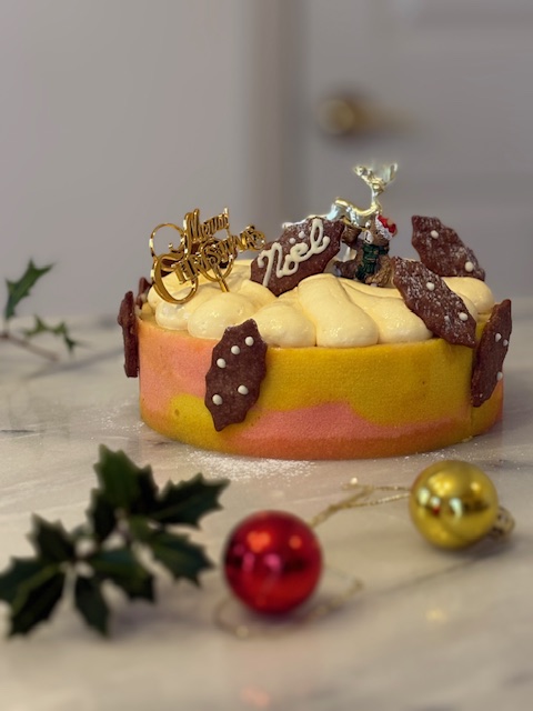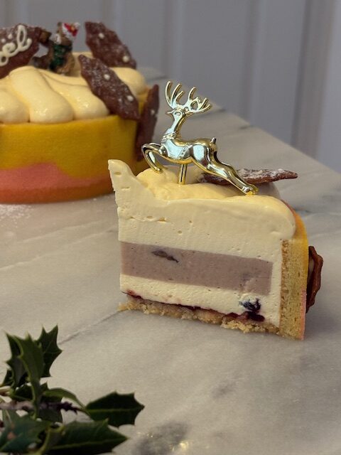 模様入りのカラフルなビスキュイジョコンドの中にビスキュイ、フロマージュムース、マロンクレムー、カシスジャム、、、などを詰め込んだ軽さと濃厚、食感のバランスを考えたクリスマスケーキです。